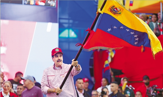 12月1日,委内瑞拉总统马杜罗在首都加拉加斯一场游行活动上挥舞国旗。马杜罗当天表示,委内瑞拉拒绝“奴隶式和平”和“殖民地式和平”。 新华社发