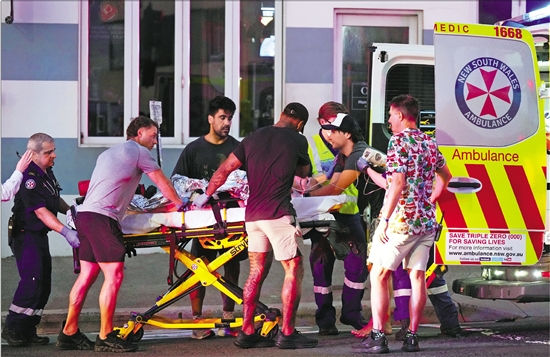 12月14日,在澳大利亚悉尼邦迪滩,医务人员将枪击案受害者送往救护车。 新华社/美联