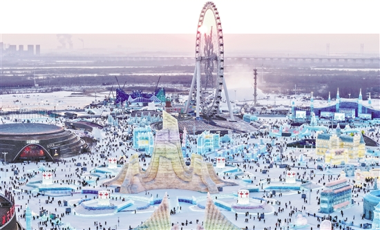 这是12月17日拍摄的哈尔滨冰雪大世界园区内的冰建景观(无人机照片)。 新华社记者 王松 摄