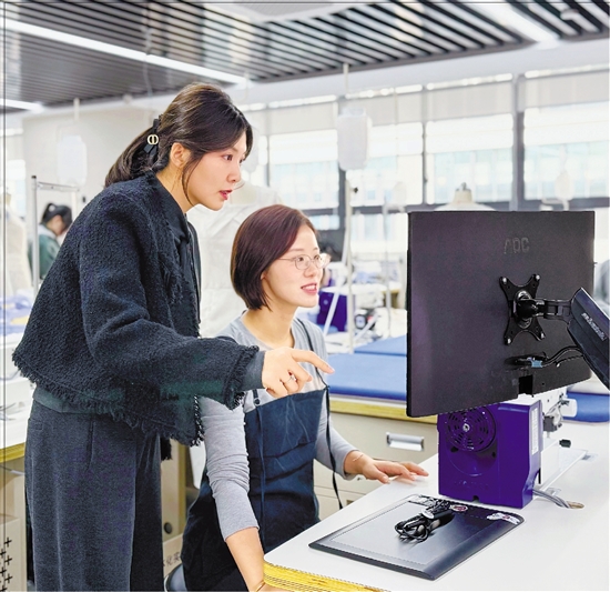 记者(前右)体验用人工智能设计服装。 通讯员 姚秀肖 摄