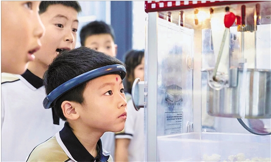 小学生佩戴脑机接口设备,用意念制作爆米花。 本报记者 金鹏 摄