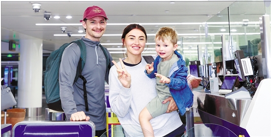 12月18日,在海口美兰边检站,入境旅客在排队等候边检查验期间留影。 新华社发(孙浩戎 摄)