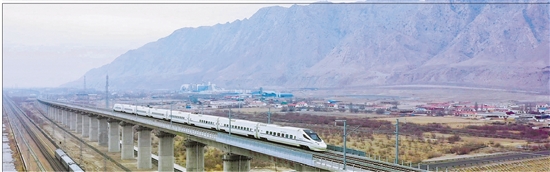 | 12月23日,包银高铁包惠段正式建成通车,包银高铁全线贯通运营,“八纵八横”高速铁路网关键一横北京至兰州通道全线贯通,完善了西北地区高铁路网。图为12月23日,D4667次动车组列车行驶在包银高铁跨215省道特大桥上。 新华社发(刘皓 摄) |