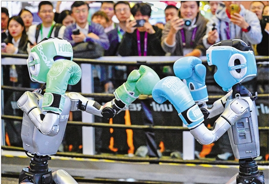 11月6日,在第八届进博会宇树科技展台,人形机器人进行格斗表演。 新华社发