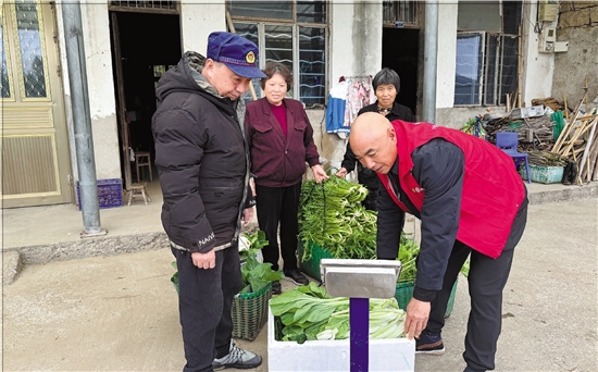 乡村供销员项加孟(前排右)给农户待收购的蔬菜称重。 通讯员 卢茴露 摄