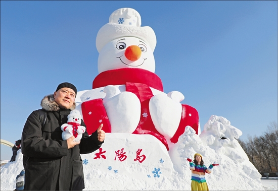 图为游客在高23.8米的太阳岛“雪人先生”前留影。 新华社发(王东 摄)