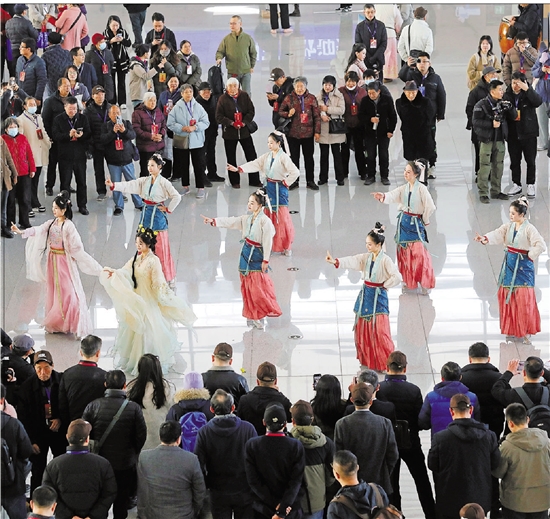 衢州西站候车大厅内,乘客正在观看文艺表演。