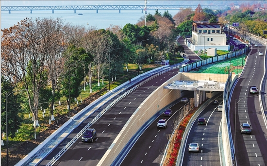 | 12月28日上午10时,杭州之江路隧道正式开通试运行。隧道西起梅灵南路,东至水澄路,主线为双向六车道,设计时速80公里。据测算,隧道投用后,之江路(复兴路—之浦路段)在非高峰期的通行能力预计提升约1.5倍,相比原地面道路可节省10至15分钟车程,且全程无红绿灯。图为之江路隧道之江路出口。 本报记者 董旭明 摄 |