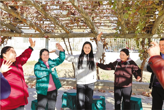 帕丽(左三)教村民们跳舞。 本报记者 王晨辉 摄
