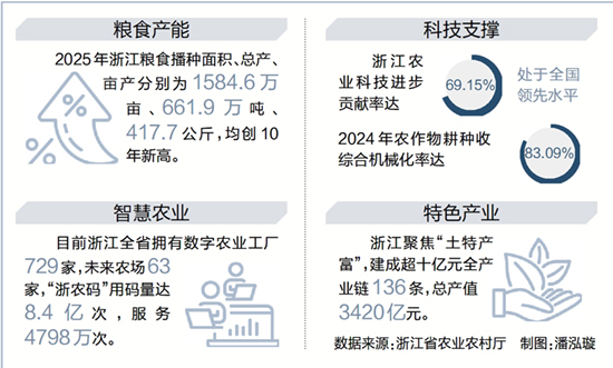 2025年浙江粮食播种面积、总产、亩产分别为1584.6万亩、661.9万吨、417.7公斤,均创10年新高。