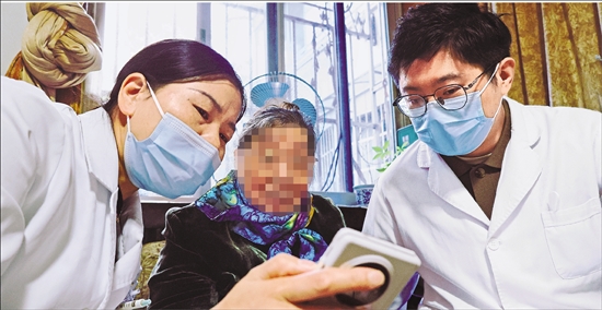 记者(右)协助操丽惠(左)对朱奶奶进行评估。 通讯员 邢银平 实习生 郑博鸿 摄