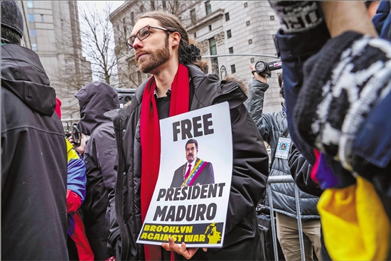 1月5日,抗议者聚集在美国纽约南区联邦地区法院外,要求释放马杜罗。 新华社发(章正浩摄)