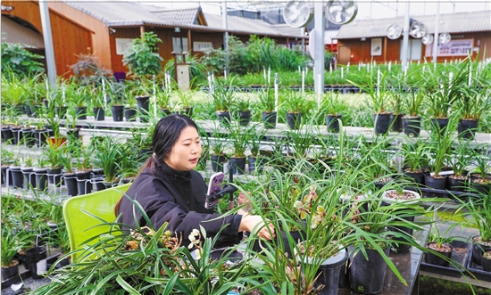 | 1月8日,在“中国花木之乡”绍兴柯桥区漓渚镇的国兰家庭农场,兰农在直播卖兰花。眼下正值兰花销售旺季,农场“传统实体店+多平台电商”的销售模式火力全开,兰花通过快递发往全国各地。该农场作为浙江省未来农场,占地85亩,种植兰花约60万盆,培育300余个兰花品种。 本报记者 梁臻 郑培庚 摄 |