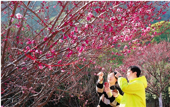 1月10日,金华市婺城区罗店镇山下曹村的尖峰梅园暗香浮动,吸引市民游客前来赏梅、游玩。 本报记者 潘秋亚 通讯员 时补法 摄