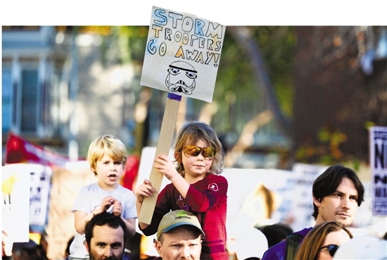 | 1月10日,在美国加利福尼亚州旧金山,一名儿童手持标语参加抗议活动。当日,市民在美国加利福尼亚州旧金山参加游行,抗议美国对委内瑞拉的军事行动,并反对美国联邦执法人员在明尼苏达州的暴力执法行为。 新华社发(朱子于 摄) |