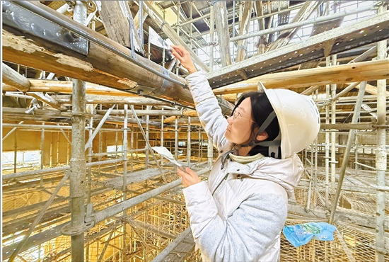记者李茸在补房梁。 见习记者 徐佳雨 摄