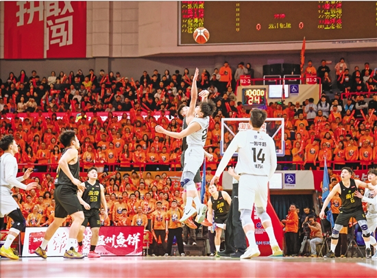 1月13日晚,“浙BA”城市争霸赛淘汰赛首轮温州队主场对阵永康队的比赛在温州体育中心打响。最终,温州队以87比61取胜。图为比赛现场。 本报记者 姚颖康 叶小西 摄