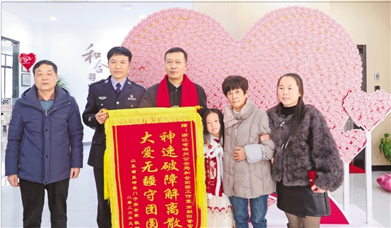 1月13日,嵊州“寻亲民警”商朝阳(左二)与寻亲家庭合影留念,这是“和合”寻亲工作室促成的第1000例团圆。 本报记者 郑培庚 阮帅 摄
