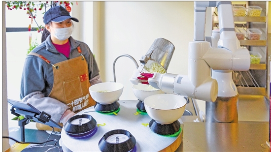 机器人餐厅内,机器人正在煮面。 通讯员 马丁 摄