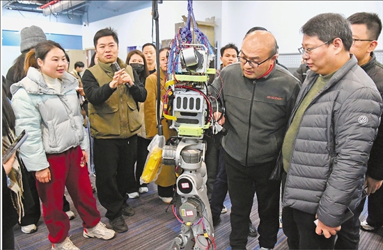 中小企业学员近日在金华参加AI场景应用培训,图为学员观摩人形机器人。 通讯员 时宽兵 摄