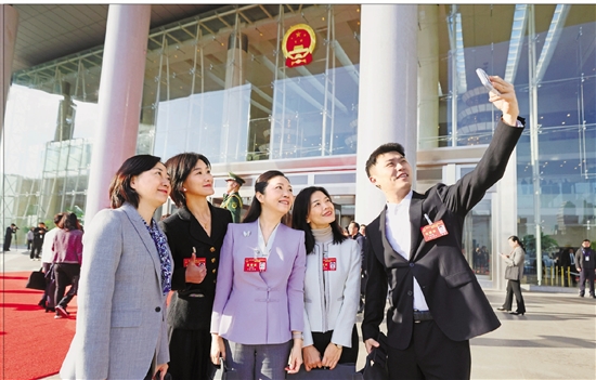 1月14日上午,省十四届人大四次会议开幕前,出席会议的省人大代表在省人民大会堂门口合影留念。