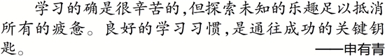 学习的确是很辛苦的,但探索未知的乐趣足以抵消所有的疲惫。良好的学习习惯,是通往成功的关键钥匙。 ——申有青