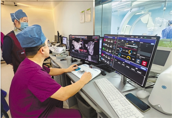 常栋利用心脏手术机器人为患者进行导管消融手术。 本报记者 周楷华 李文瑶 摄