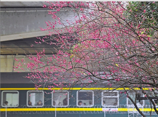 1月25日,杭州凯旋路和凤起路交界处的铁路桥边,红梅悄然绽放。 通讯员 里尔 摄