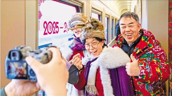 | 1月25日,在黑龙江省哈尔滨开往亚布力方向的Y783次“悠享龙江·银旅号”旅游列车上,旅客们换上各式服装,体验免费旅拍服务。这是中国铁路哈尔滨局集团有限公司今年开行的首趟旅拍列车,车体升级,空间更大,为旅客打造移动“照相馆”,提升旅客的旅拍体验。 新华社记者 张涛 摄 |
