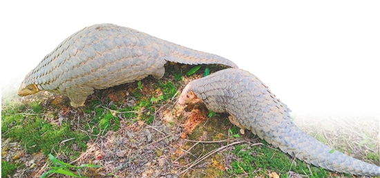 研究基地里两只被救助的穿山甲在户外活动。 受访者供图