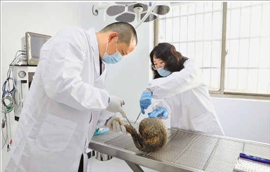 记者(右)和工作人员一起给穿山甲做检查。 共享联盟·婺城 戴翔 摄