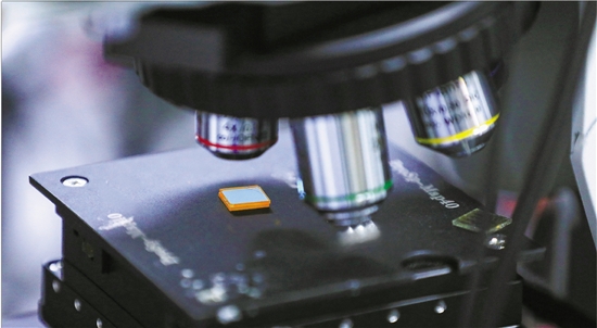 研发人员将钙钛矿激光器样品放在显微镜下观察。