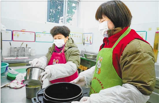 爱心共享厨房内,志愿者为病人家属端来炖煮好的餐食。 本报记者 邱建平 摄