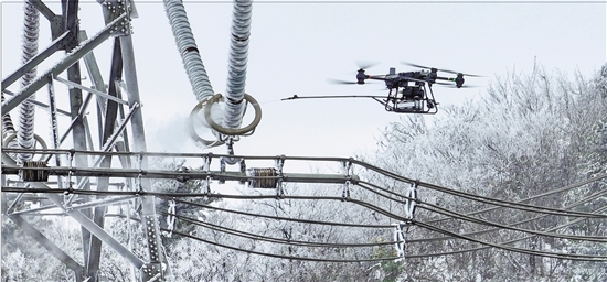 | 2月1日,在杭州市临安区太阳镇鹤岭村,国网杭州供电公司采用无人机热射流带电除冰技术,对±800千伏灵绍线3060号杆塔的绝缘子开展除冰作业。该技术适用于高海拔、重覆冰地区,作业人员无需登塔,避免高空作业和触电风险。 本报记者 朱海伟 通讯员 胡建强 吴忱 摄 |