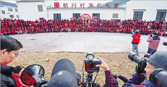 2月1日,建德市航头镇航川村800余名新老村民齐聚文化礼堂,在文化特派员、摄影志愿者等的协助下,拍下“全村福”。 本报记者 彭鹏 共享联盟·建德航头 董倩 摄