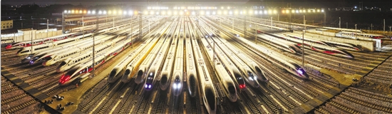 2月1日,在中国铁路广州局集团有限公司广州动车段,一列列动车组排列整齐,停靠在存车场,如同一支“陆地舰队”,整装待发。2月2日,2026年春运将正式拉开帷幕。 新华社记者 邓华 摄