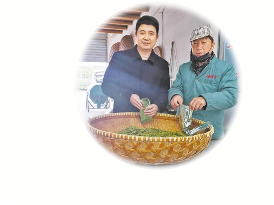 一任接着一任干,帮扶干部接续助力。图为工行驻村干部陈军阳与村干部一起包装预订的茶叶。