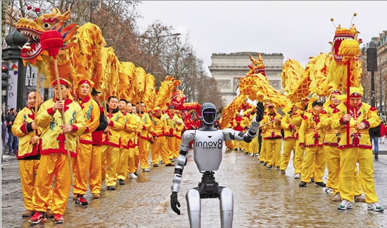 2月1日,在香榭丽舍大街,由宇树科技及其法国代理INNOV8集团提供的机器人参加巡游活动。