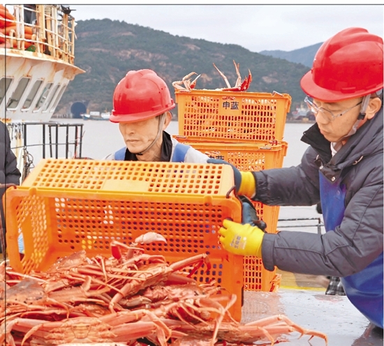 工人在卸货新鲜雪蟹。