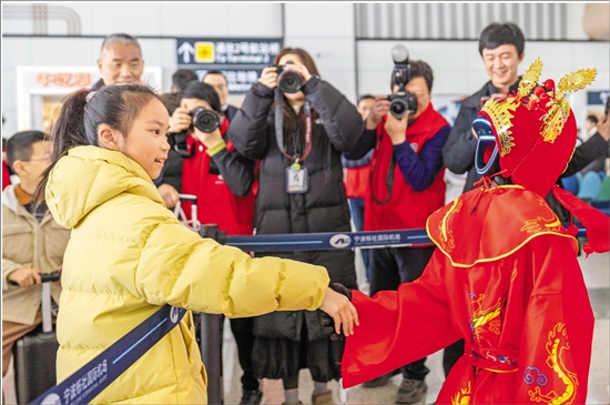 2月2日,宁波栎社国际机场迎来机械“财神”和机械“舞狮”队,为旅客送上精彩纷呈的科技拜年秀。图为小朋友和机械“财神”握手。 本报记者 贺元凯 通讯员 沙燚杉 摄