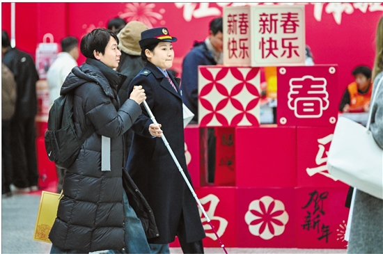 2月2日,在杭州东站,车站工作人员为一位视障旅客引路。