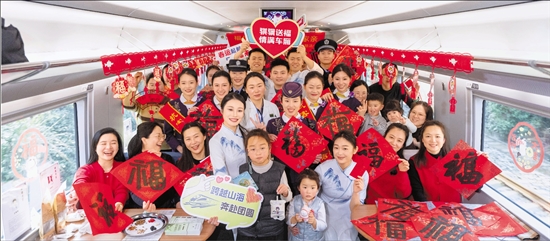 2月2日,春运首日,杭州客运段G7467次列车餐车化身“健康文化客厅”,中医问诊、新春写福、快板表演、互动抽奖……多元服务融合成一道流动的风景,让旅客的回家路满载年味。