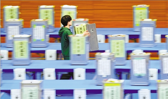 2月8日,在日本东京,工作人员在一处计票站内工作。 新华社记者 贾浩成 摄