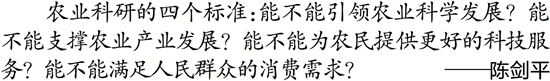 农业科研的四个标准:能不能引领农业科学发展?能不能支撑农业产业发展?能不能为农民提供更好的科技服务?能不能满足人民群众的消费需求? ——陈剑平