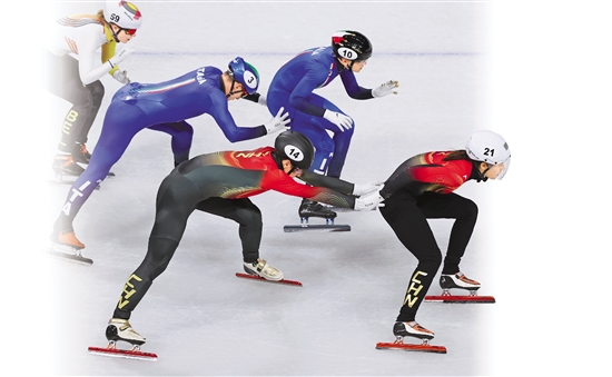 2月10日,中国队选手刘少昂(前左)和张楚桐(前右)在比赛中交接。新华社记者 胡星宇 摄