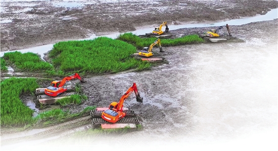 挖掘机在舟山清理互花米草(资料照片)。 受访者供图