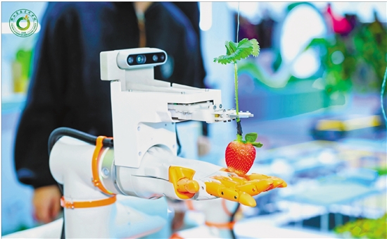 植物工厂里采摘机器人剪草莓。 受访者供图