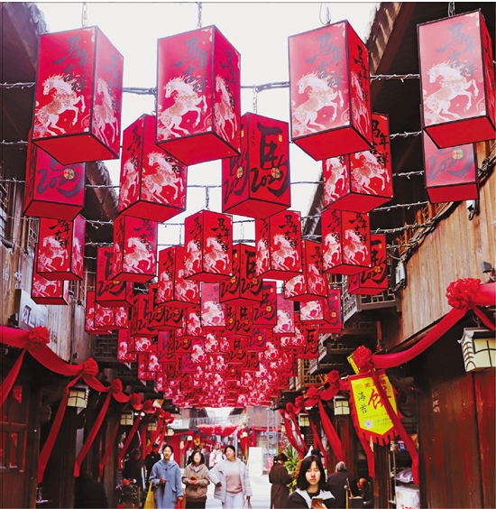 2月11日,游客走在张灯结彩的台州市路桥区十里长街。 通讯员 蒋友青 摄