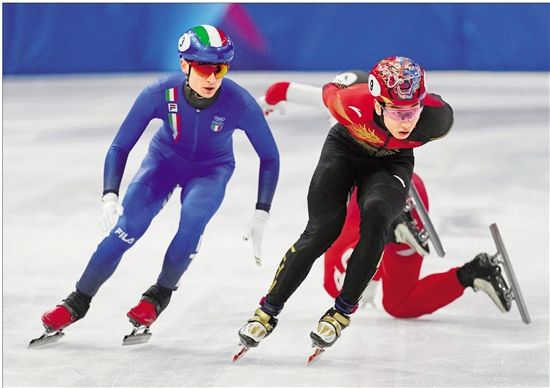 2月12日,孙龙(右)在四分之一决赛中。 新华社记者 薛宇舸 摄