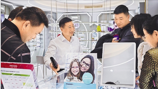 陶秀青(中)为经销商讲解店铺布局。 本报记者 许峰 摄